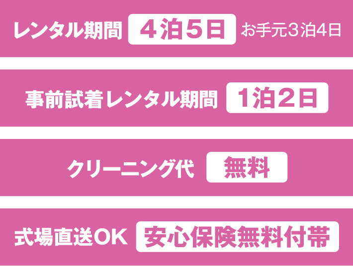 貸衣装だからこそ、品質管理を徹底し心を込めてご用意しておりますので、ぜひ、私たちのサービスをご利用いただき、その素晴らしさをご実感くださいませ。
