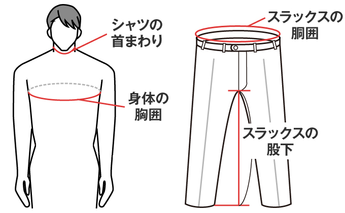 ご予約/試着申し込み時には、身長、胸囲(バスト)、ウエスト(ズボンのベルト位置)、股下(平置きして股の縫い目がクロスする地点からスソまでの長さ)、その他のサイズ(シャツ首まわり、靴サイズなど)をご確認ください。